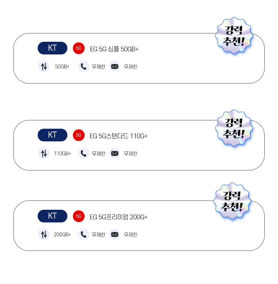 | EG 5G스탠다드 110G+ | 110GB+ | 기본제공 | 기본제공 | 월 51,700원 월 19,900원 7개월이후 평생 51,700원 |